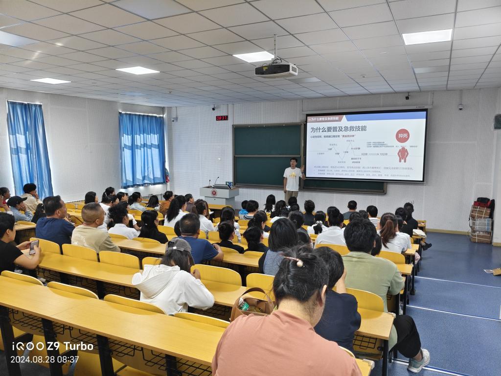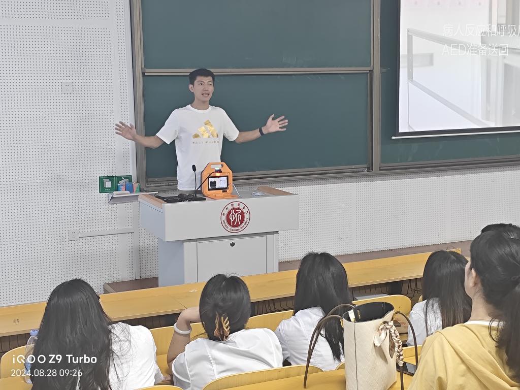 为提升师生员工应对突发心脏病的急救能力,强化师生员工的生命救治和身体健康意识,后勤管理部卫生科特邀红会急救员导师(AHA急救员导师)李昂阳,为我校卫生所全体医护人员、各系辅导员、体育系教师、图书馆人员以及宿管人员等重点岗位人员做了急救知识和AED(除颤器)使用技能的专题培训讲座。